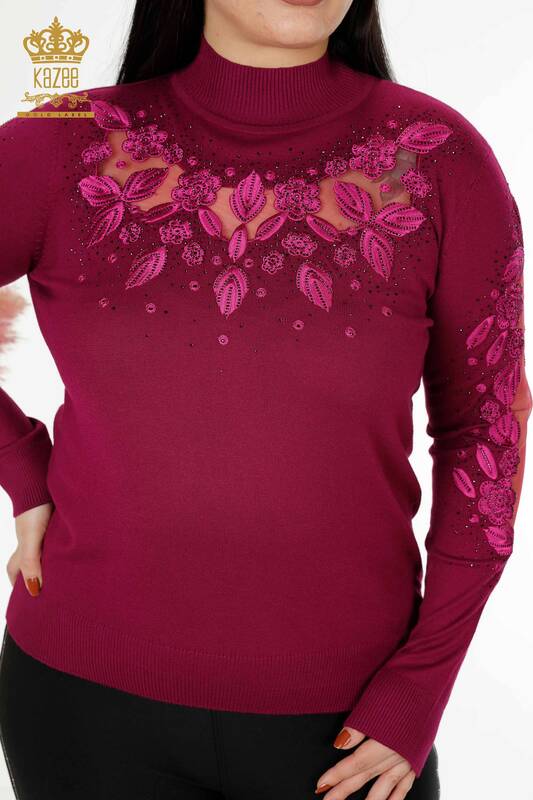Оптовая Женщин Трикотаж Свитер Рукавом Тюль Детальный Камень Вышитый Фиолетовый - 30123 | КАЗЕЕ