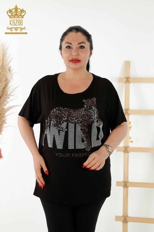 оптом женская блузка с изображением тигра, вышитая черным камнем - 77713 | КАЗЕЕ