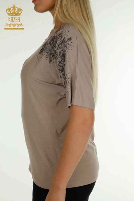 Оптовая Женская Блузка Цветочным Узором Вышитая Камнем Норка - 79097 | КАЗЕЕ