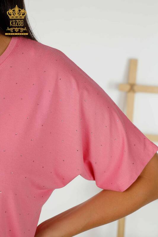 Оптовая Женская Блузка С Коротким Рукавом Кристаллический Камень Вышитый Розовый - 79389 | КАЗЕЕ