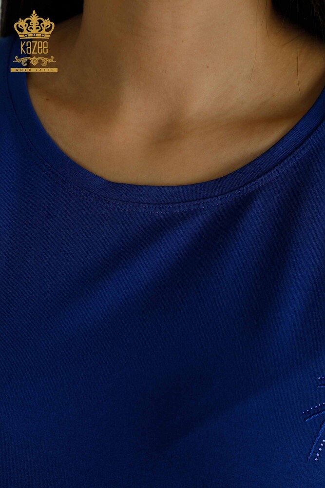 оптом Женская блузка с коротким рукавом, вышитая камнем, тюль, детализированная Saks - 79302 | КАЗЕЕ