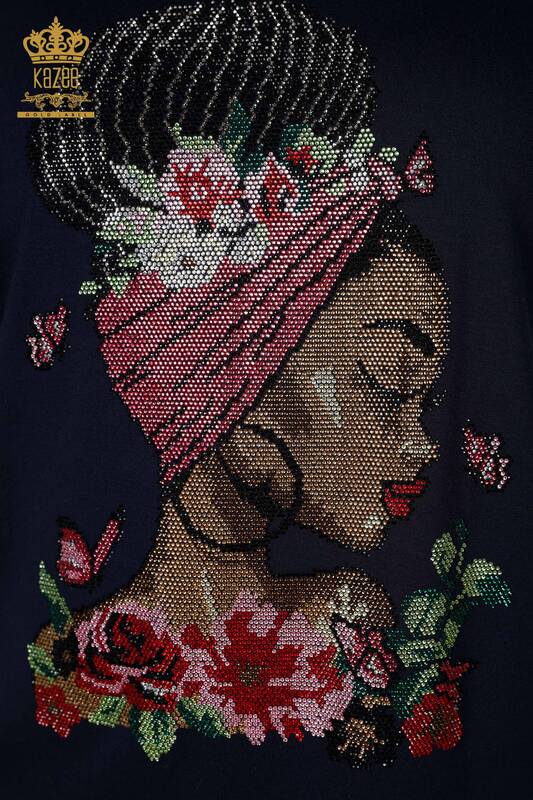 оптом Женская блузка с узором из цветного камня с вышивкой темно-синего цвета - 78913 | КАЗЕЕ