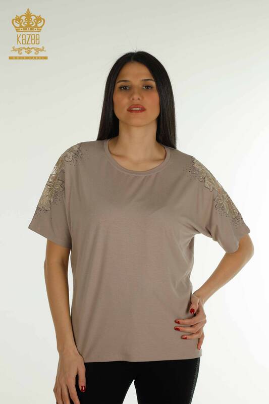 Оптовая Женская Блузка Тюль Детальный Короткий Рукав Камень Вышитая Норка - 79390 | КАЗЕЕ