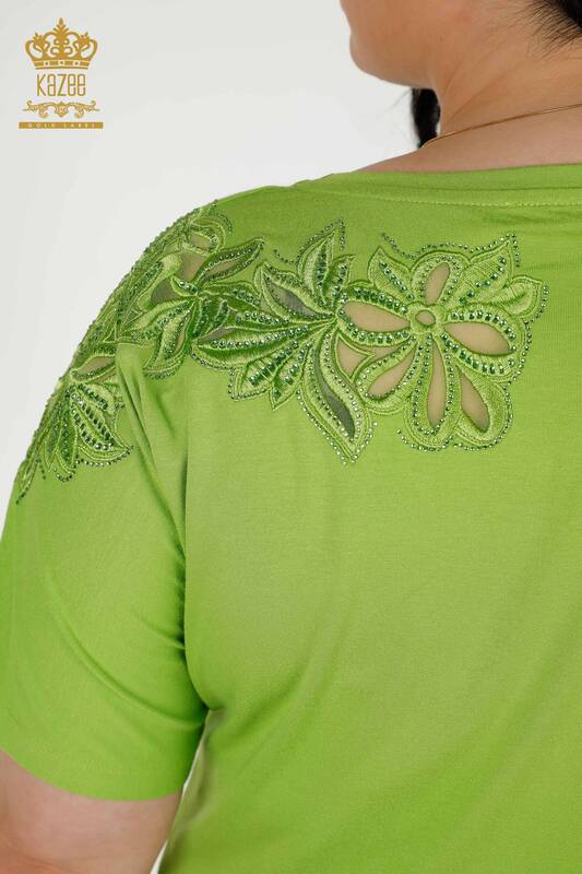 Оптовая Женская Блузка Тюль Подробный Цветочный Узор Камень Вышитый Фисташково-Зеленый - 79086 | КАЗЕЕ