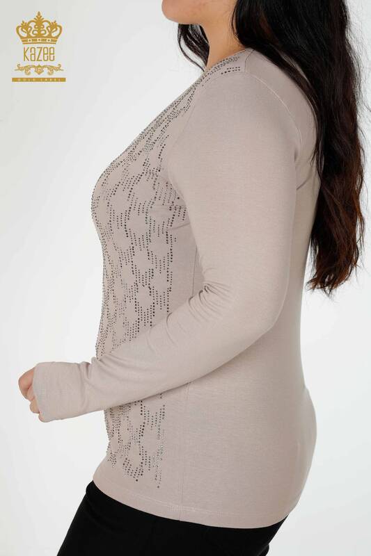 Женская блузка оптом с V-образным вырезом из норки, вышитая камнем - 79016 | КАЗЕЕ