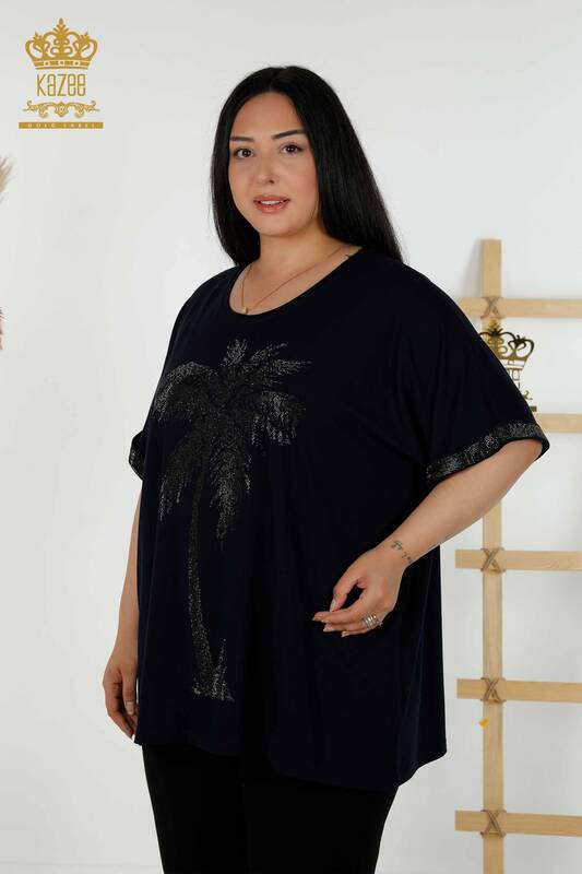 оптовая продажа женская блузка вышитая камнем с коротким рукавом темно-синий узор - 79325 | КАЗЕЕ