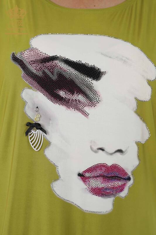 Оптовая женская блузка с цифровой печатью, вышитая камнем, с коротким рукавом, фисташковый зеленый - 77755 | KAZEE