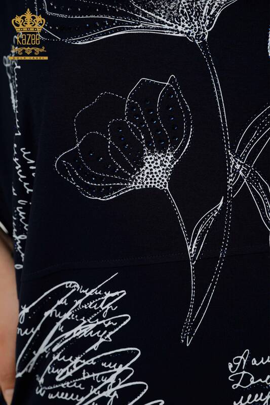 Женская блузка с цветочным узором, вышитая камнем, темно-синяя - 79059 | КАЗЕЕ