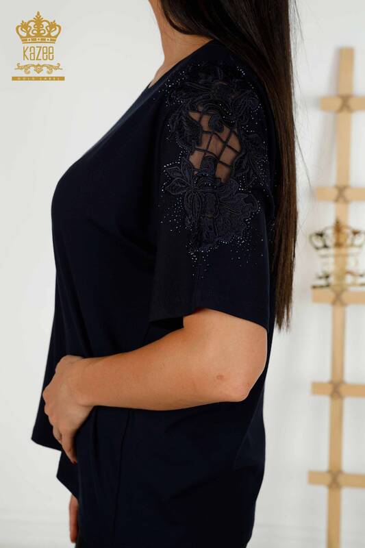 Оптовая Женская Блузка Тюль Детальный Короткий Рукав Вышитый Камнем Темно-Синий - 79390 | КАЗЕЕ
