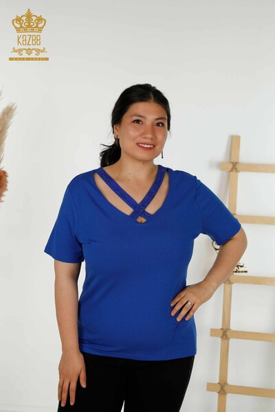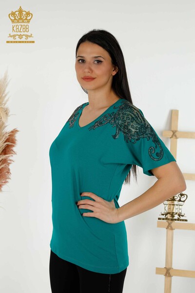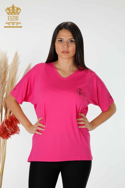 Оптовая Женская Блузка Стрекоза Подробная Вышитая Камнем Розовый - 79362 | КАЗЕЕ