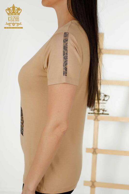 оптом женская блузка с леопардовым принтом, вышитая камнем, с коротким рукавом, бежевая - 78942 | КАЗЕЕ