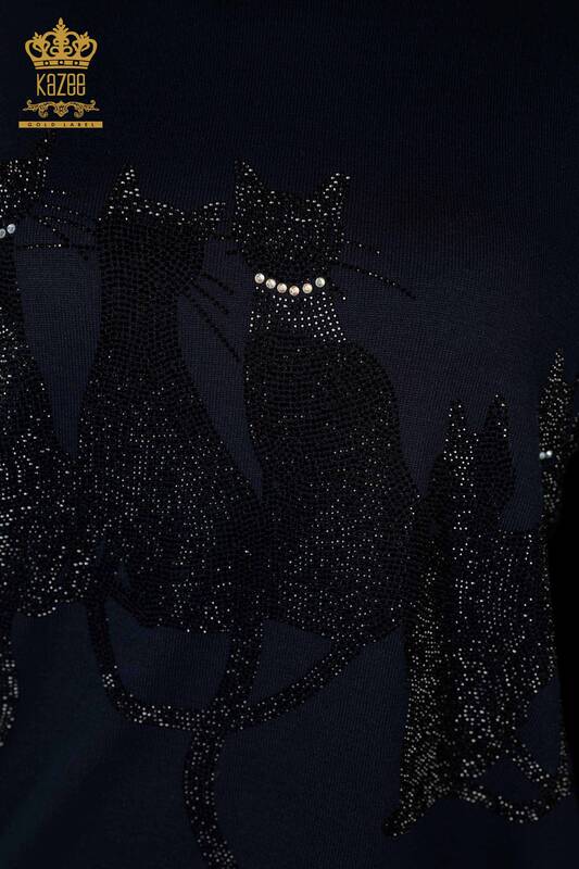 Оптовая Женщин Трикотаж Свитер Кошка Шаблон Вышитые Камнем Темно-Синий - 16969 | КАЗЕЕ