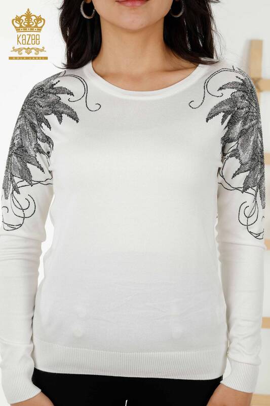оптом женский трикотаж свитер плеча цветок вышитый камнем вышитый экрю - 30210 | КАЗЕЕ