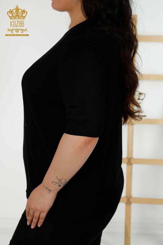 оптом женский трикотаж свитер с цветочным узором с коротким рукавом вышитый камнем черный - 16963 | КАЗЕЕ