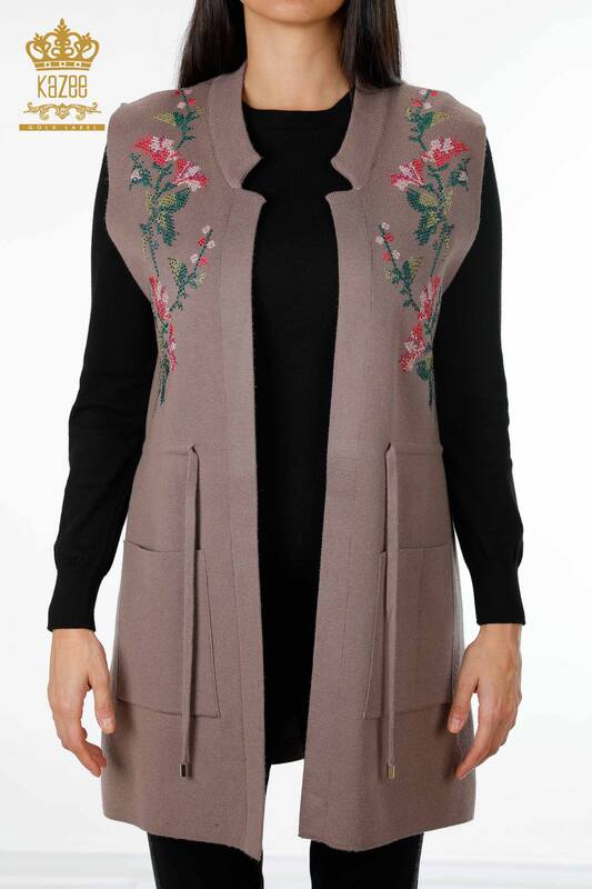 Женский трикотажный жилет оптом с двумя караманом с камнями вышовкой узорами - 16844 | КАZЕЕ