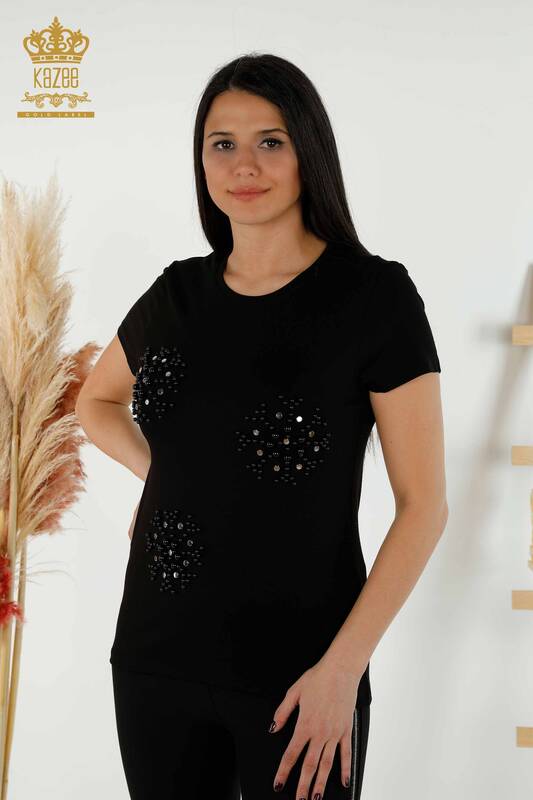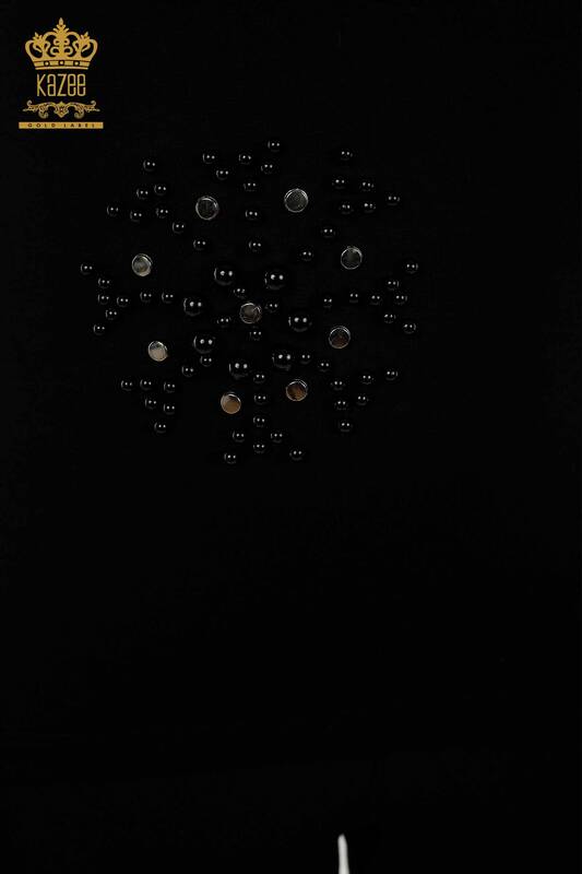 Женская блузка оптом с вышивкой бисером и круглым вырезом черного цвета - 79201 | КАЗЕЕ